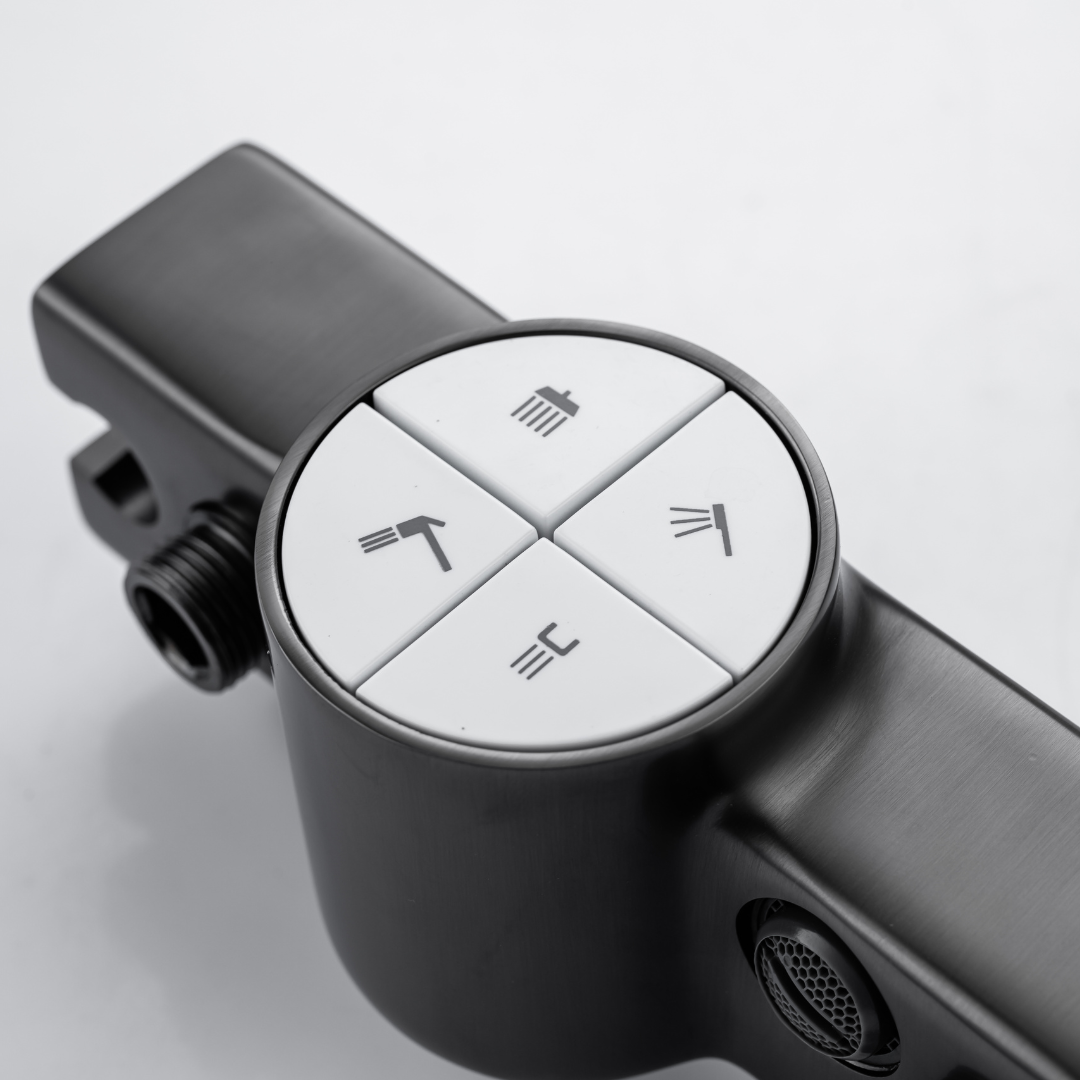 Le Angelo en Gunmetal Grey offre un look audacieux et industriel combiné à la fonctionnalité et à la sécurité. Ce set de douche à effet pluie thermostatique avec 4 fonctions — douche pluie, douche à main sur barre coulissante, jet et sortie — transforme chaque douche en une expérience luxueuse. La finition gunmetal robuste donne une apparence moderne et pleine de caractère.